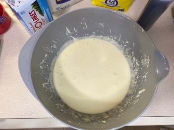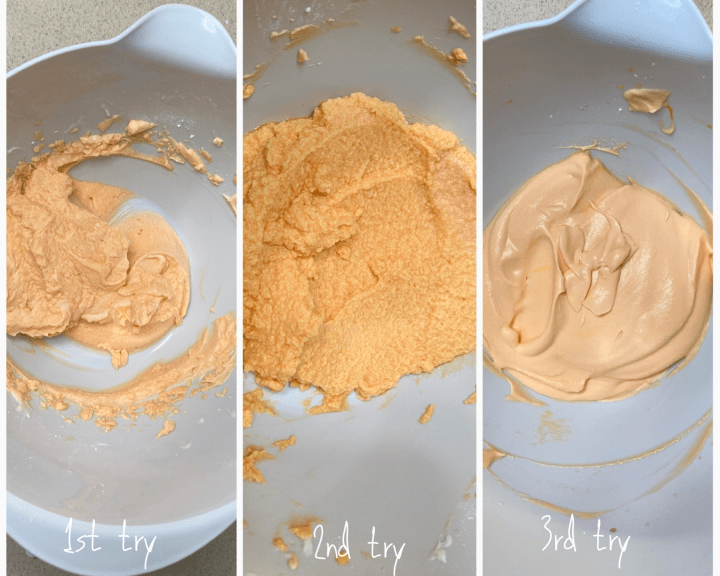 My whipped cream kept curdling the first 2 tries. That was because I was whipping my cream till it had stiff peaks, add the food coloring, and whip again. On the third try, I added the food coloring in the beginning and it came out so smooth (third times a charm)! The color was not what I had in mind but I was too afraid to add more food coloring and ruin how good it was. I ended up not even using most of the whipped cream because it wasn’t holding up that well.
