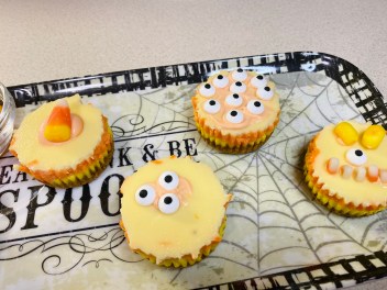 11. Time to decorate! I topped some of them with a whipped topping, cute little candy eyes I found at the store, and of course candy corn.