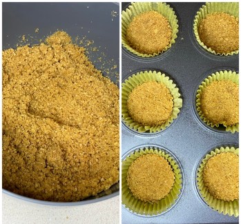 2. Combine graham cracker crumbs and melted butter till it is nice and crumbly. Then pack down about 2 tablespoons of the crumbs in the cupcake liners. Bake the crusts for 5 minutes and then let them cool.