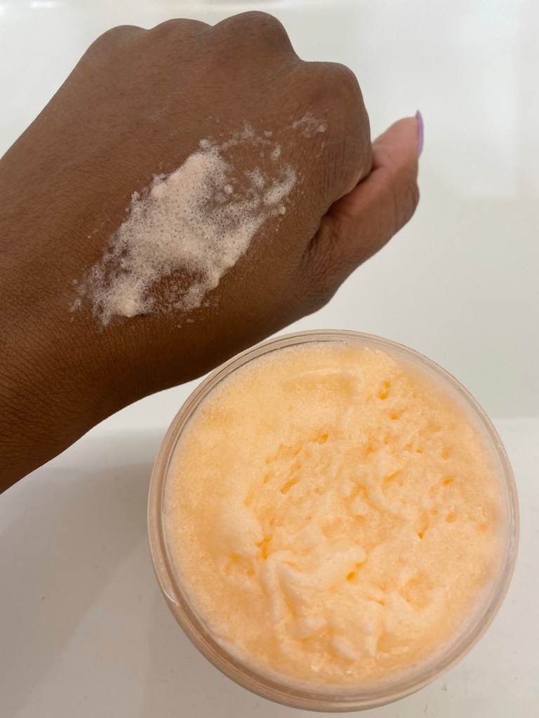This moisturizing sugar scrub takes exfoliates dead skin cells away, leaving the skin feeling hydrated, soft, and smooth. I’m not a fan of peach at all. I must say, I was a little nervous when I saw it was a peach-scented product. Every peach-scented product I’ve ever smelt was too strong of an artificial peach scent. However, this body scrub was very subtle. I was pleasantly surprised. I tested some of the product on my hand, and it felt great! It is indeed exfoliating but melted and became super silky. Now the real test was to use it during my shower routine. After a couple of times testing the product I really enjoyed it. I left it for the end of my shower routine so my skin would be nice and prepped for exfoliation and let me tell you something. The process from beginning to end felt great. After massaging the scrub into the skin and rinsing it off, I was left feeling nice and smooth. The best part about it was that I wasn’t left smelling like an artificial peach. Then, finish it off with your favorite moisturizer to lock it all in.