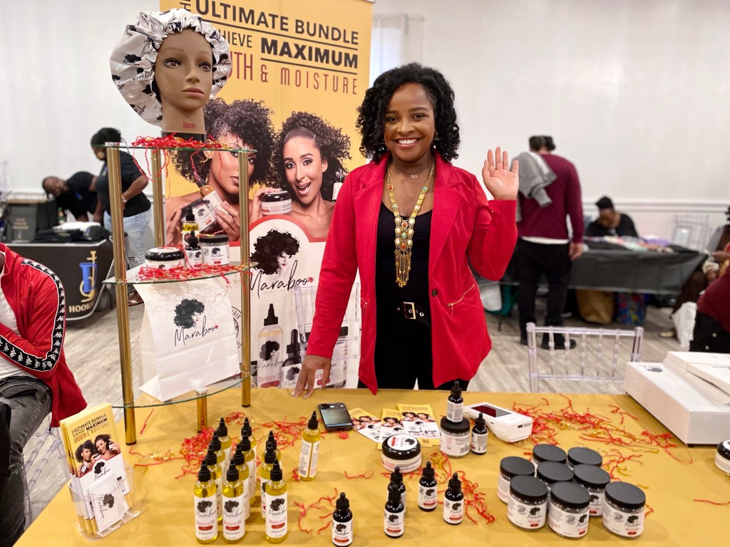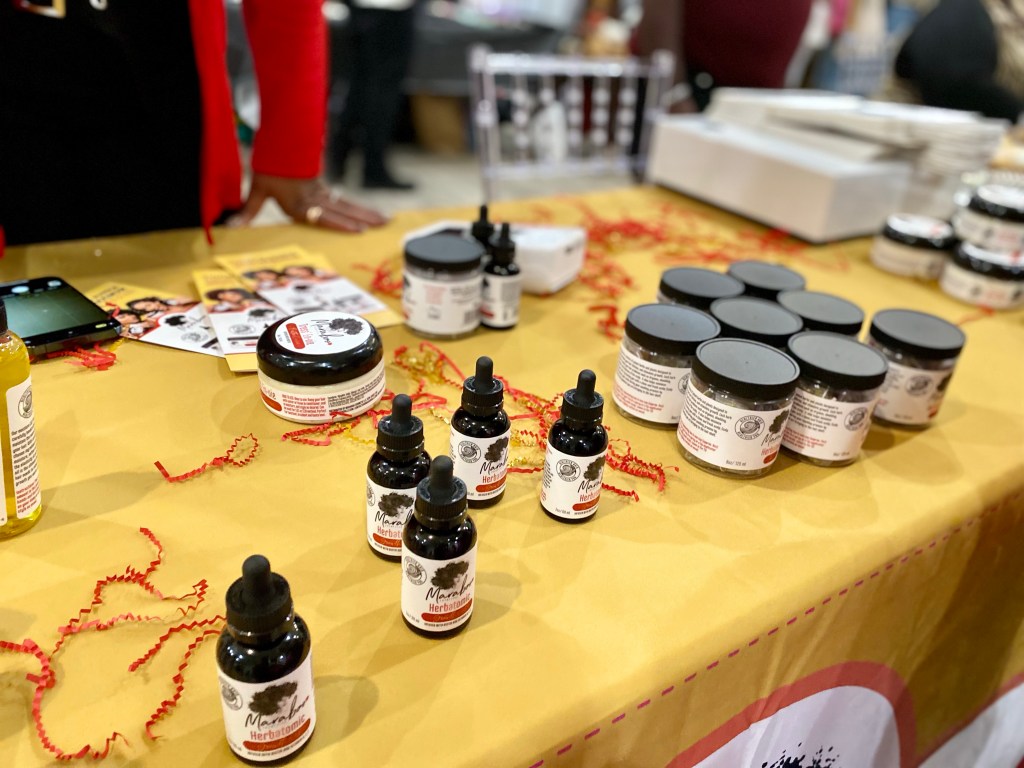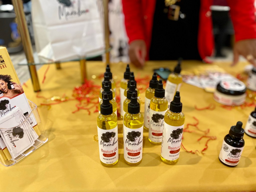 Maraboo Cosmetics is an organic plant-based natural hair care line designed to grow and maintain hair growth. She sold me when she pulled a strand of her natural curly locs and it landed down by her chest. I’m a sucker for a good natural hair product, especially when there is living proof. Also, it’s not as easy finding products that work for natural hair. I look forward to trying the Herbatomic growth oil that I got. She offers plenty of other products like butter cream, scalp rejuvenating tea, and more.