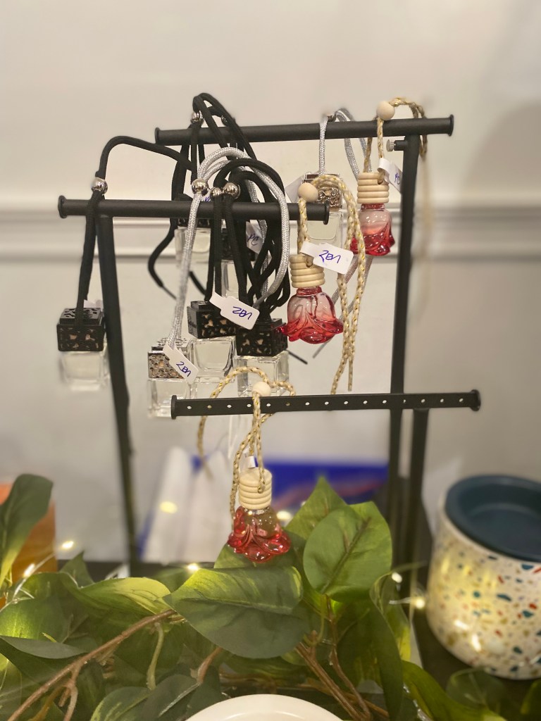 Liquid Sanity is more than just a candle company. They make unique and memorable candles that will leave a long lasting impression. All of their candles are created with 100% coconut wax or premium mineral oil wax. They use NO chemicals or dye. This lovely set up caught my eye when I saw the words ‘car diffuser’ I love when my car smells well so this table was definitely on my list. They offer a great amount of different candles, air fresheners, wax melts, and more. I got the Woosah candle and of course, the matching car diffuser to go with it. The designs are really pretty! She also threw in an air freshener in Japanese Squash for me! You can never have too many of those.