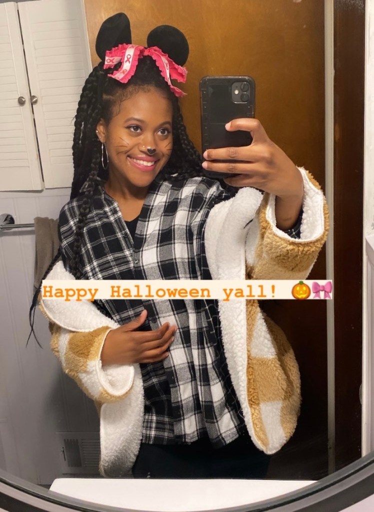 I needed to be festive somehow so I threw something together quickly. I had some mouse ears that my sister let me borrow and a sac full of old cheer bows. I became the Breast Cancer Awareness Mouse!