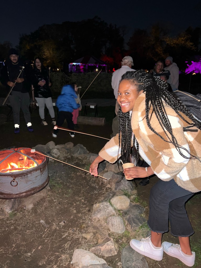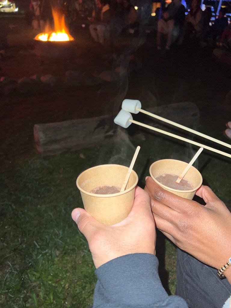 After putting up with the fall chill for a while, we joined the crowd around the campfire for songs, games, and roasting marshmallows! How cool is that? I felt like I was a little kid at sleep-away camp. We also got to sip some delicious hot chocolate.