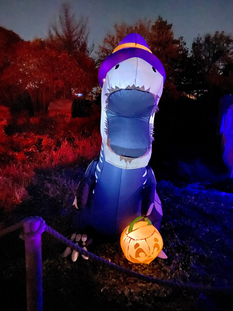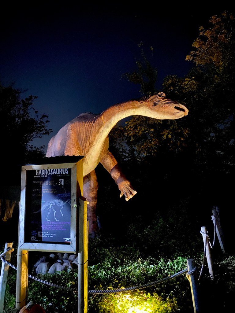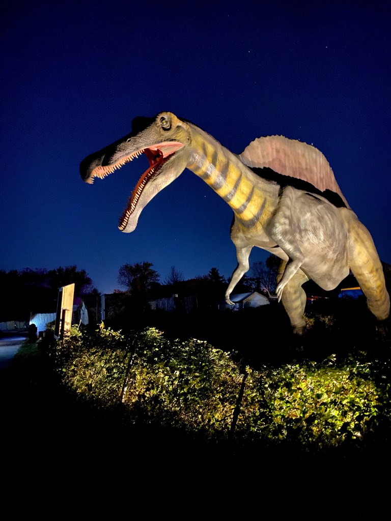We immediately went off on a mysteriously lit trail to see which dinosaurs we would find. We did hear talks of a vicious T-Rex on the loose but thankfully we didn’t run into it. While Isaiah was mesmerized by the huge dinosaurs, Dwayne and I were trying to see who pronounced the name better lol.